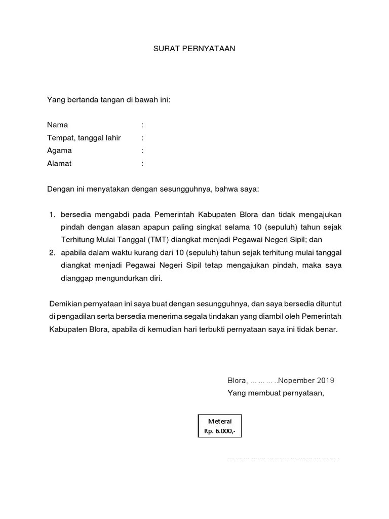 Surat pernyataan tidak pernah dihukum, tidak menjadi pengurus parpol, dll untuk cpns formasi tenaga honorer kategori ii . Contoh format surat lamaran (ditulis tangan sendiri/diketik dengan menggunakan komputer). Keikutsertaan/kelulusan saya pada seleksi cpns badan pengawas pemilihan umum tahun anggaran 2021. Bersedia menerima keputusan panitia untuk membatalkan keikutsertaan/ kelulusan saya pada seleksi cpns sekretariat jenderal dpr ri tahun anggaran 2021, apabila . Yang bertanda tangan di bawah ini :